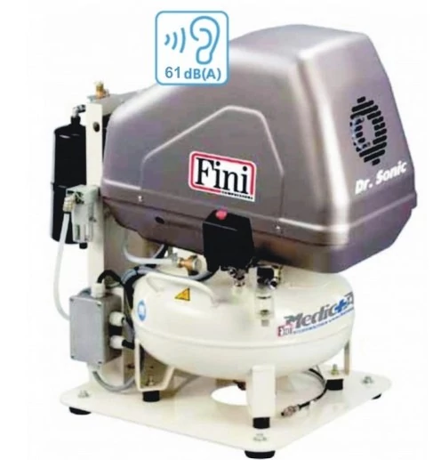 OLAJMENTES fogászati kompresszorok. A Fini MedicAir kompresszorok két különböző konfigurációban készülnek: Med és Dr Sonic. A Med sorozat: hangszigetelés és adszorpciós szárító nélkül kerül piacra. A Dr Sonic sorozat: extra-hangszigetelt verzió minden tartozékkal felszerelve. Jellemzők: 24 literes tartály belső korrózióálló felületkezeléssel - Olajmentes dugattyúk ellenőrzött alapanyagból, nagy teljesítményű hűtőventilátor és kényszerhűtés a maximális hűtési hatékonyság érdekében - Ki-be kapcsoló - Rezgéscsillapító gumibak - Levegő kimeneti szűrő - Dupla fogantyú segíti a mozgást - Motor hővédelem - Hangszigetelt, egyoszlopos szárítóval szerelt kivitel (FM) Dr. Sonic néven rendelhető